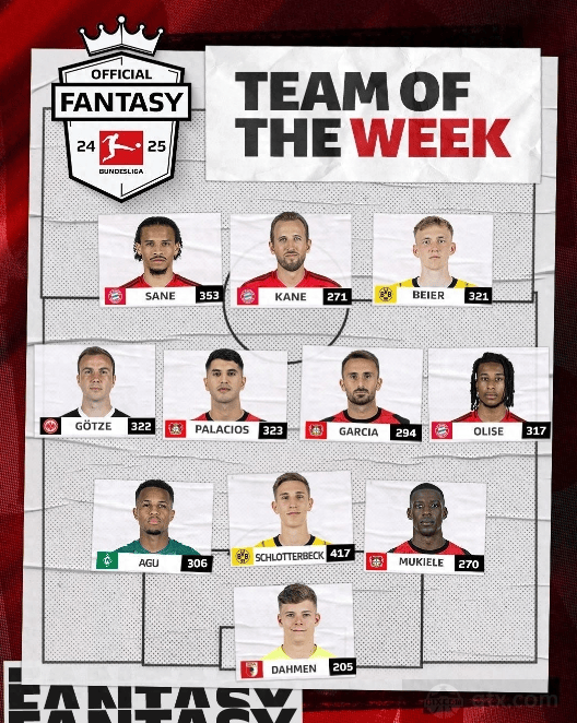 在上周末德甲联赛第27轮结束了全部比赛的较量,德甲联赛官方在对球员的表现进行评价之后,发布了本轮德甲的最佳阵容,在这份阵容中有多名效力于德甲联赛豪门以及强队的球员入选,其中拜仁慕尼黑与勒沃库森入选人数最多,各有3名球员入选,多特蒙德有2名球员入选,法兰克福、奥格斯堡以及不莱梅各有1名球员入选。在这份最佳阵容中,拜仁慕尼黑本轮比赛出场的锋线三叉戟球员凯恩、奥利塞以及萨内都有入选。