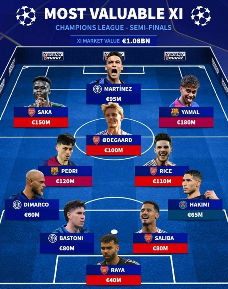 直播吧5月1日讯 本赛季欧冠半决赛激战正酣,德转也盘点了4支球队最贵阵容,其中阿森纳5人在列,具体如下:门将:拉亚(阿森纳,4000万欧)后卫:迪马尔科(国米,6000万欧)、巴斯托尼(国米,8000万欧)、萨利巴(阿森纳,8000万欧)、阿什拉夫(巴黎,6500万欧)中场:佩德里(巴萨,1.2亿欧...